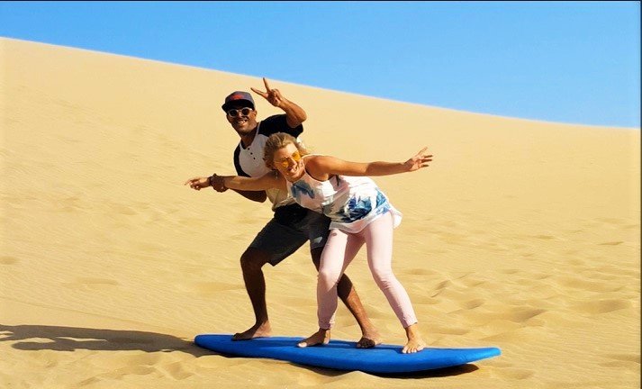 Your sand surfing experience takes place on the golden dunes overlooking the wild Taboga Beach. Marvel at panoramic ocean views, feel the adrenaline of gliding down the sandy slopes, and cap off your adventure by watching a spectacular sunset over the beach, complete with a traditional Moroccan mint tea break and a delicious homemade lunch.