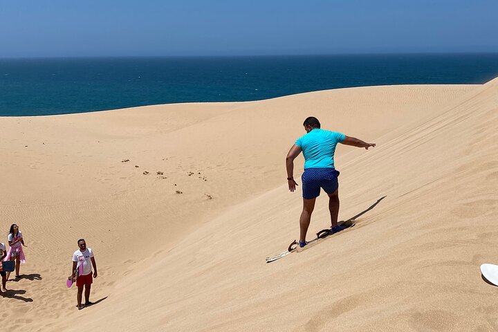 Experience the thrill of Sunset Sandboarding in Taghazoute! This half-day adventure takes you on a scenic journey north of Agadir to the Moroccan desert-style dunes of Timlalin. After an exhilarating session of sand surfing on the golden dunes with a stunning Atlantic Ocean backdrop, you’ll be rewarded with a beautiful sunset over the wild Taboga Beach. It’s the perfect blend of adventure, culture, and breathtaking natural beauty.